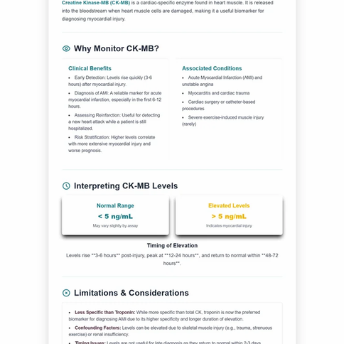 The SpotSense Creatine Kinase-MB Rapid Test Kit is a highly accurate diagnostic solution for the detection of Creatine Kinase-MB levels in human samples. CK-MB is a specific cardiac biomarker, widely used to confirm acute myocardial infarction (heart attack) and monitor cardiac muscle damage.